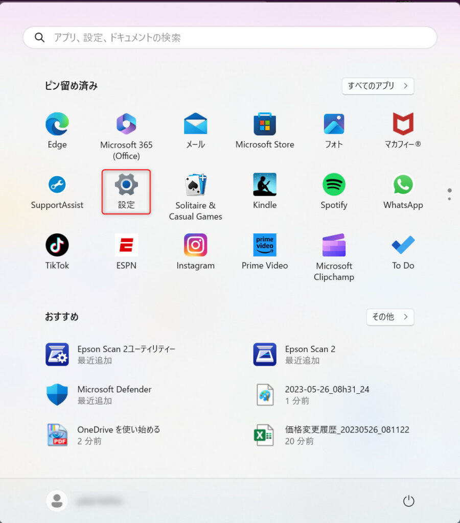①Windowsメニューより【設定】をクリック