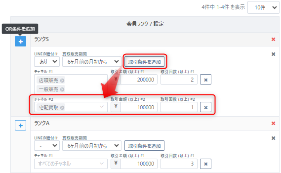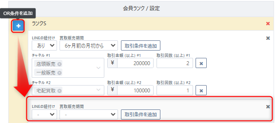 こちらは、AまたはBの条件を満たす場合に、会員はSランクに自動で設定されます。