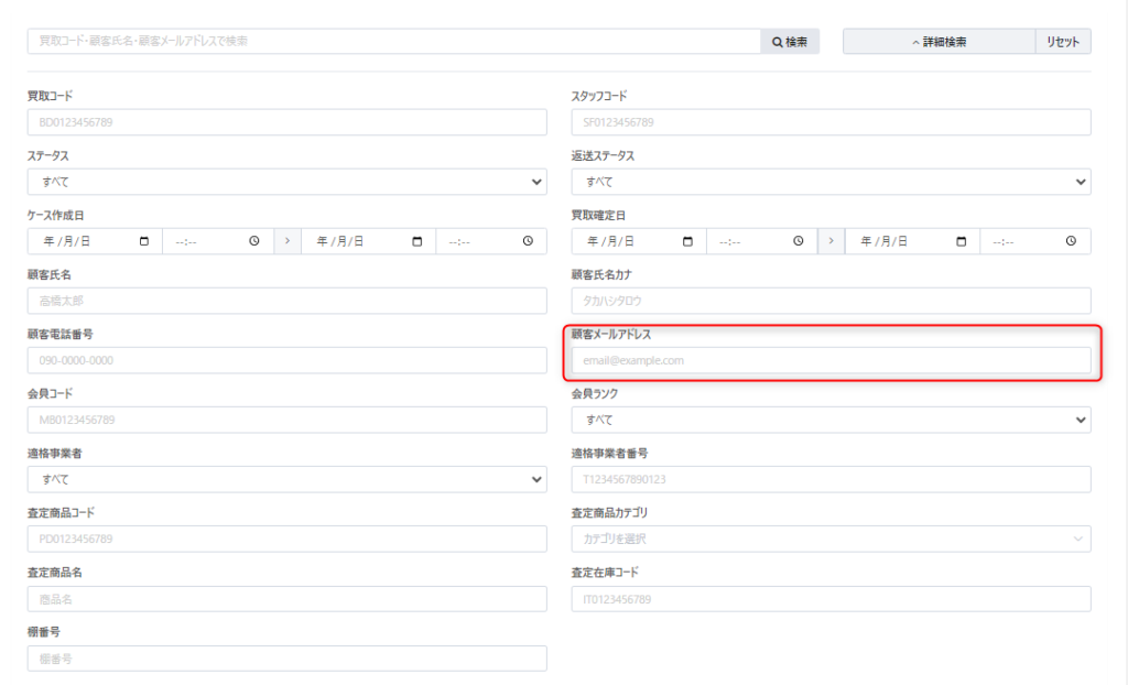 【宅配買取>ケースリスト】画面の【詳細検索】においても【顧客メールアドレス】項目が追加されております。