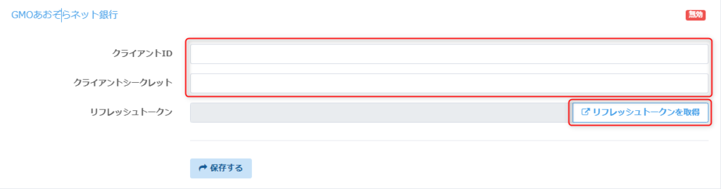 ・銀行より送付のAPI連携接続情報通知書に表示されている【クライアントID】【クライアントシークレット】を入力