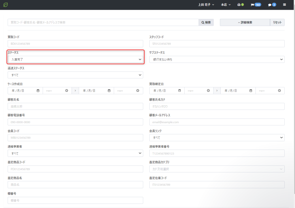 【宅配買取>ケースリスト】画面の【詳細検索】より【ステータス】『入庫完了』を指定のうえ、検索します。