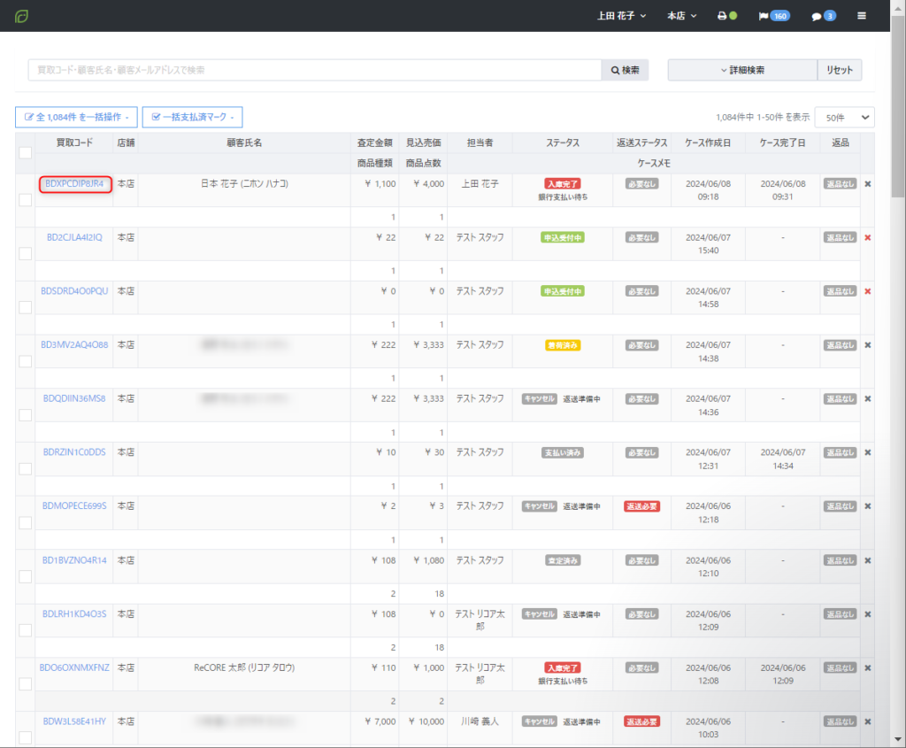 エラーの一覧【ケースリスト】画面より、【買取コード】・【仕入コード】をクリックしてケースの詳細状況を確認します。