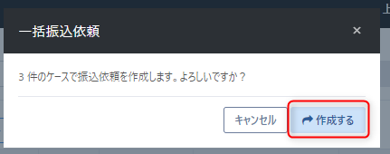画像のように選択した件数分の依頼作成の確認メッセージが表示され、間違いないことを確認のうえ【作成する】をクリック