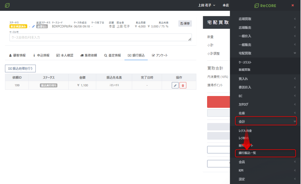RECOREの対象メニューより買取依頼者(仕入取引先)の銀行口座へ送金依頼ができます。