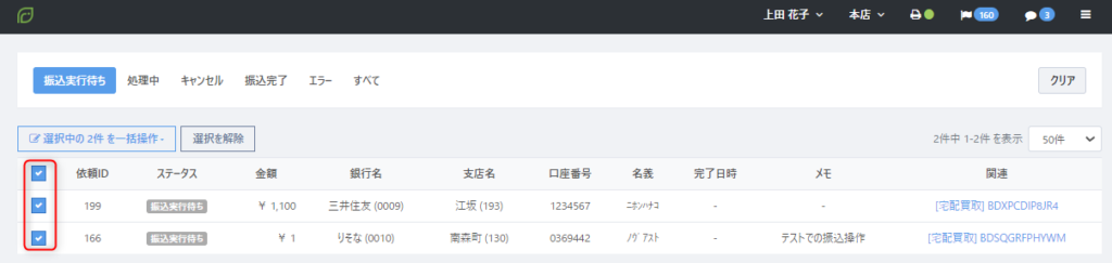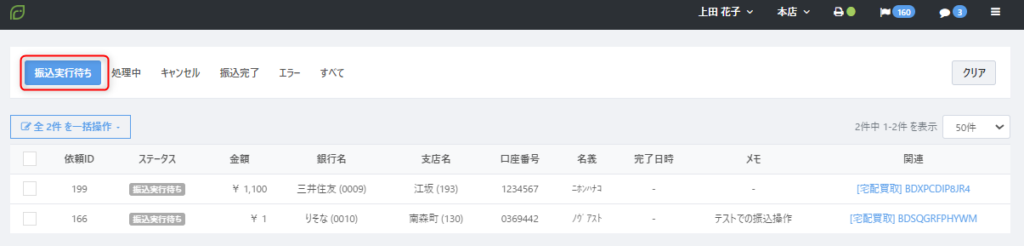振込処理の登録後は、ステータスが『振込実行待ち』になります。