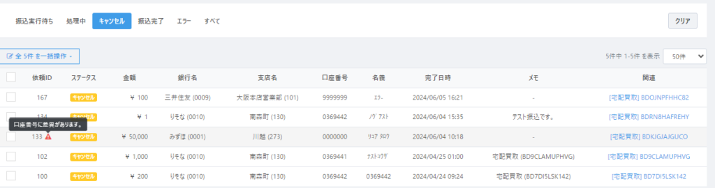 ステータス『エラー』にカーソル合わせることで、振込実行されなかった要因が表示されます。