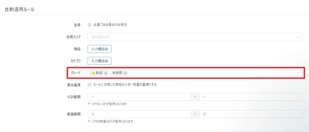 今回のリリースによりクーポン設定の自動適用ルールに「グレード」の項目を追加いたしました。