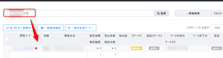 2.【一括着荷確認】画面に、店舗に到着した買取品(着荷箱)の送り状記載の顧客氏名や、申込時の顧客の電話番号、伝票番号など入力のうえ【検索】結果から一覧に追加するケースを選択します。