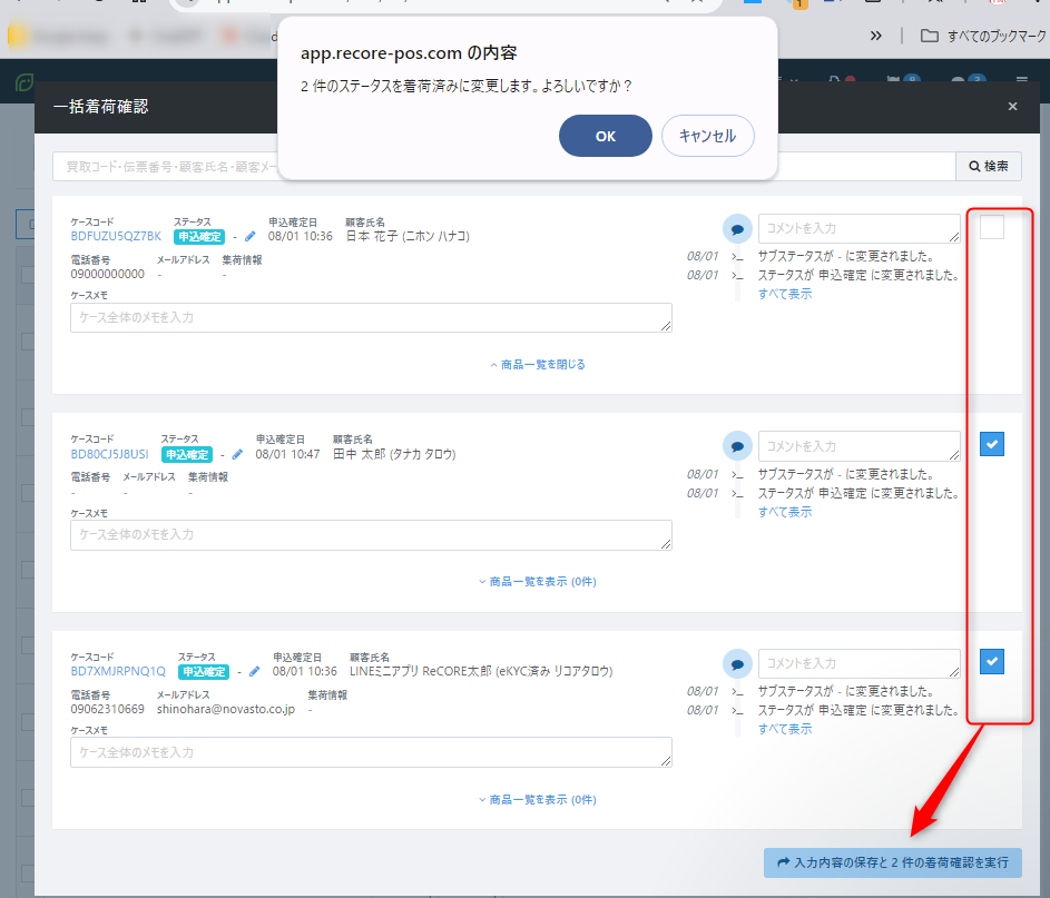 3.検索結果として以下の添付画像の様にケース情報が追加されます。ステータス【着荷済み】に更新したいケースの画面右側にチェックが入っていることを確認し【入力内容の確認と〇件の着荷確認を実行】をクリックします。