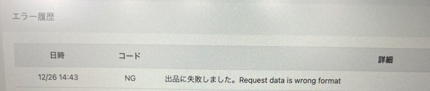 楽天出品操作後に【出品リスト】画面で出品ステータス『エラー』と表示され、出品の詳細画面の「エラー履歴」に以下のエラーが表示された場合の原因と対応方法を解説します。
