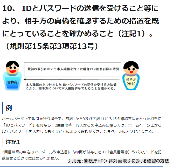 LINEミニアプリから宅配買取の申込がされることで、警視庁が定める非対面取引の本人確認方法の内「10、 IDとパスワードの送信を受けること等により、相手方の真偽を確認するための措置を既にとっていることを確かめること(注記1)。(規則第15条第3項第13号)」への対応が可能です。