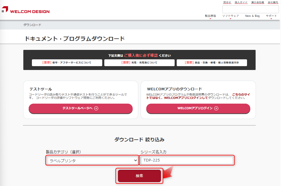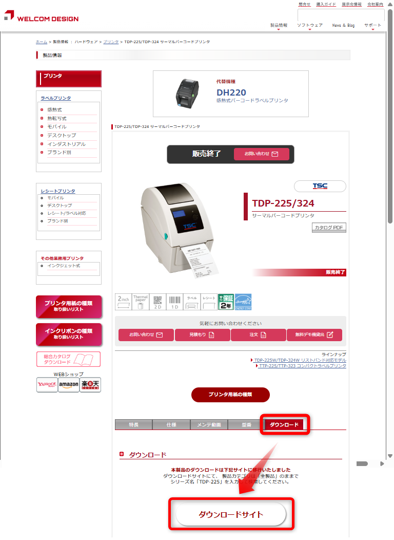 以下のURLをクリックして開き、ラベルプリンター機器の商品紹介ページの【ダウンロード】タブをクリック後に【ダウンロードサイト】をクリックし、ページへ移動します。