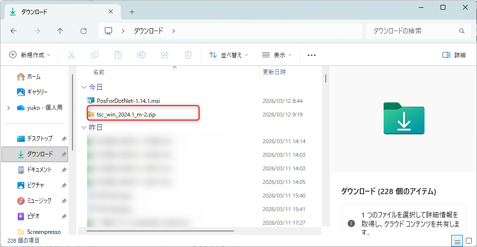 ダウンロードされた【tsc_win_2024.1_m-2.zip】ファイルを右クリックし、【すべて展開】をクリックして展開します。