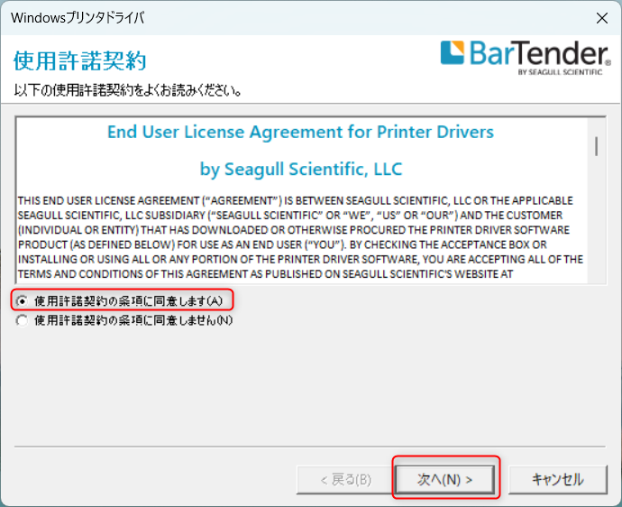 使用許諾契約画面の【使用許諾の条項に同意します】にチェックを入れ、【次へ】をクリックします。