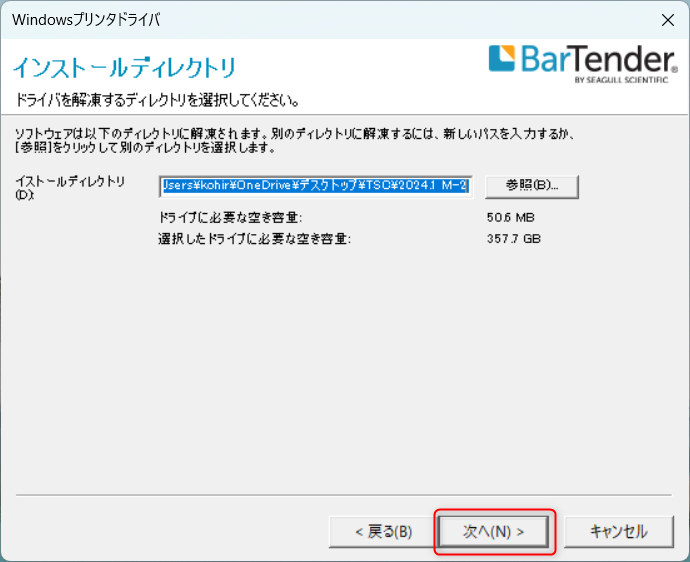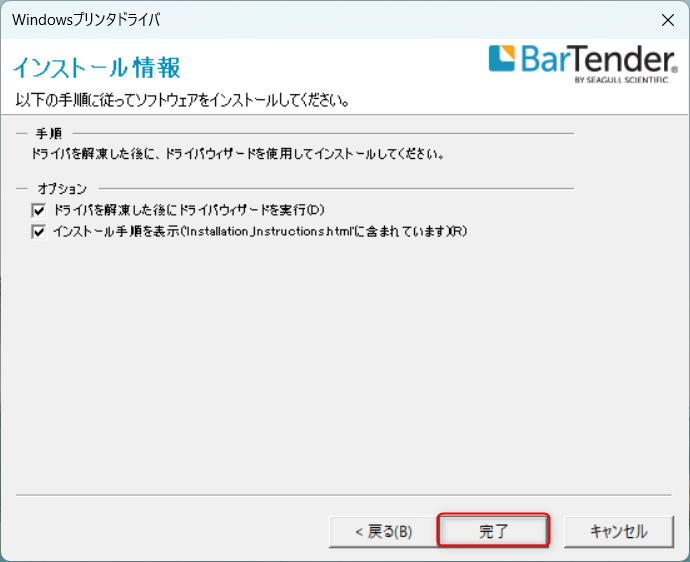 最後に【インストール】ボタンをクリックし、「SeagullDriverウィザードが正しく終了されました。」と表示されたら【閉じる】ボタンをクリックします。
