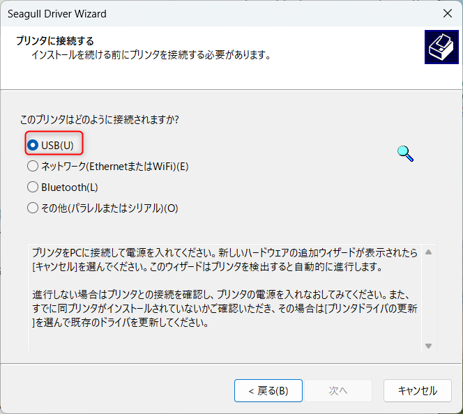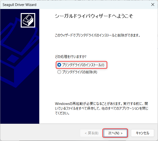 【シーガルドライバウィザードへようこそ】画面では、【プリンタドライバのインストール】を選び【次へ】をクリックします。