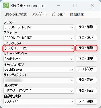 「ラベルプリンター」項に『[TSC]TDP-225』表示を確認のうえ、【テスト印刷】をクリックします。