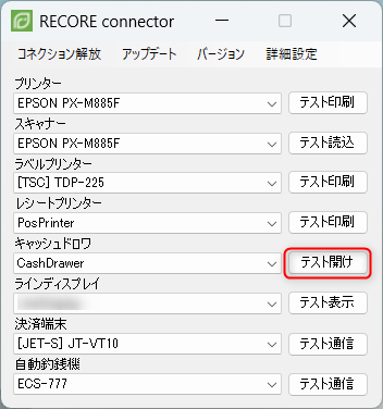 「キャッシュドロアー」項に『CashDrawer』表示を確認のうえ、【テスト開け】をクリック後に、キャッシュドロアーが開くと、設定完了です。