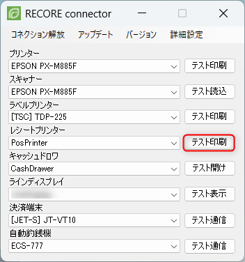 「RECORE connectorテストプリント」と印字されたレシート用紙が出力されれば設定が完了です。