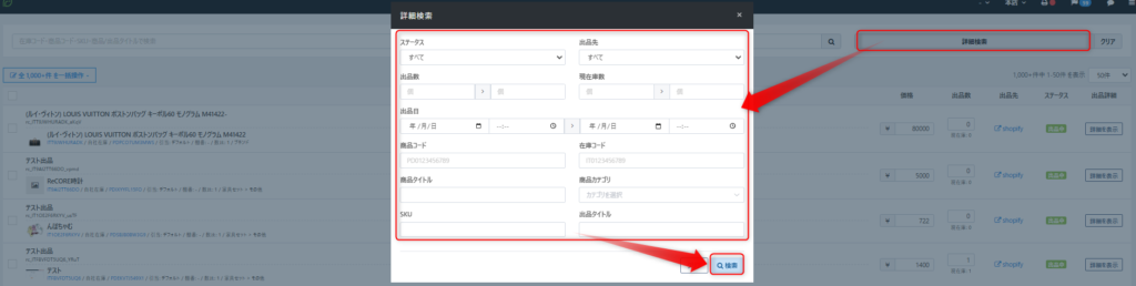 【出品リスト】の【詳細検索】より、以下検索条件を入力のうえ【検索】クリック