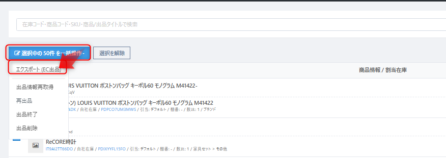 出力する出品データにチェックを付け、【選択中の〇件を一括操作】>【エクスポート(EC出品)】をクリックしデータを出力する