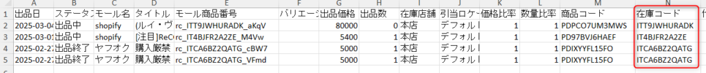 出力データを開き、出品する在庫を【在庫コード】項より確認する