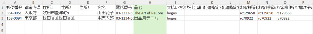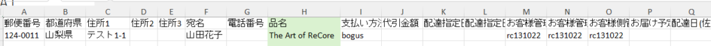 RECOREにおいて、【EC】>【受注管理】より出力した「エクスポート(EC受注)」データ内の【H列:品名】に、任意の情報を表示させることができます。