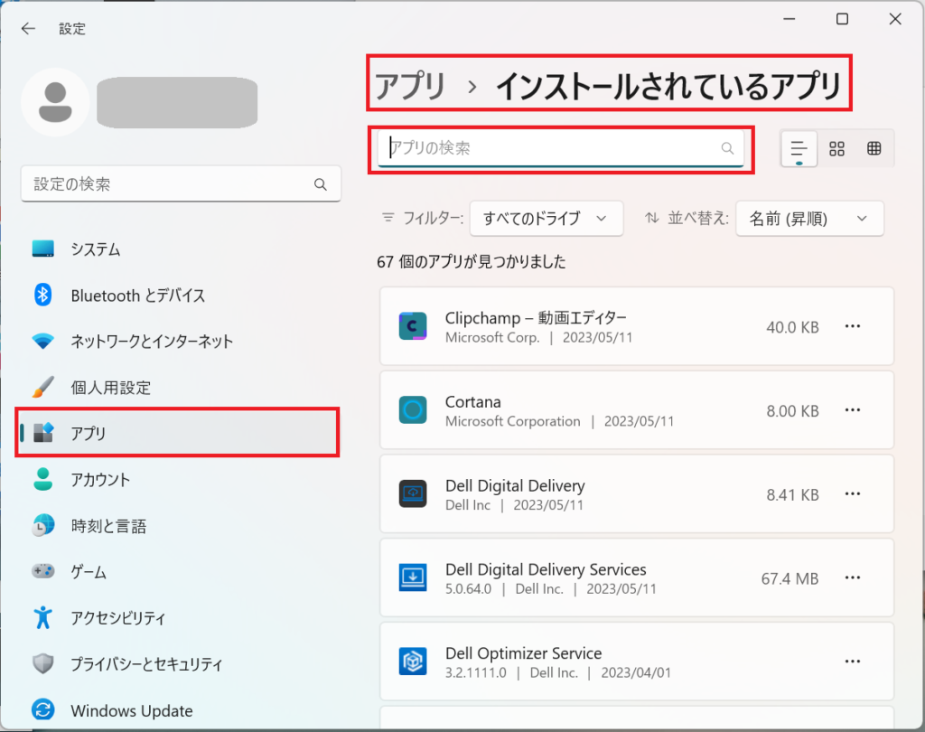 ④以下の削除するアプリを1点ずつ検索確認し、表示されたアプリ右側にある【…】を右クリック>【アンインストール】を選択 し削除する