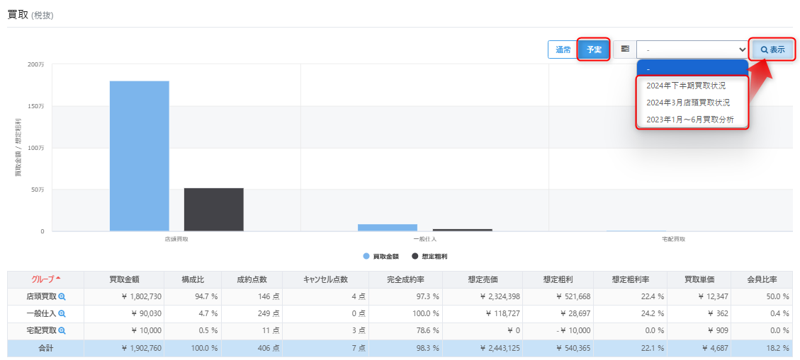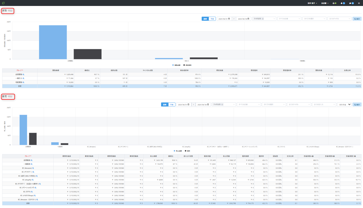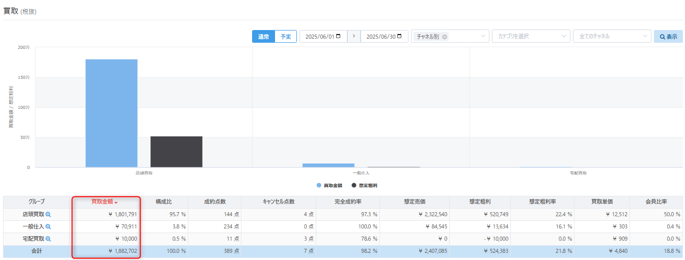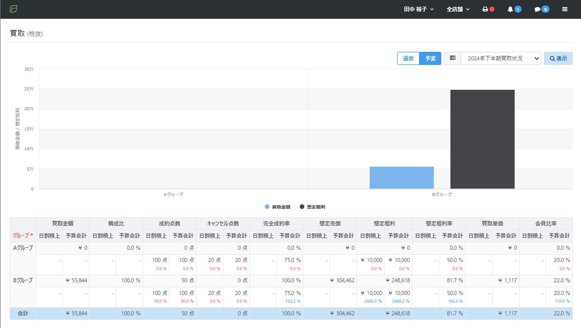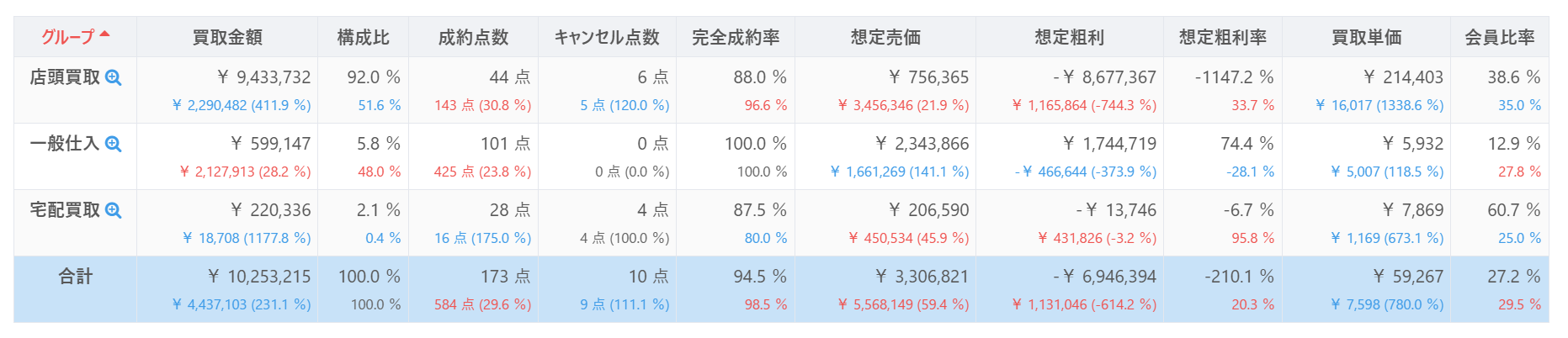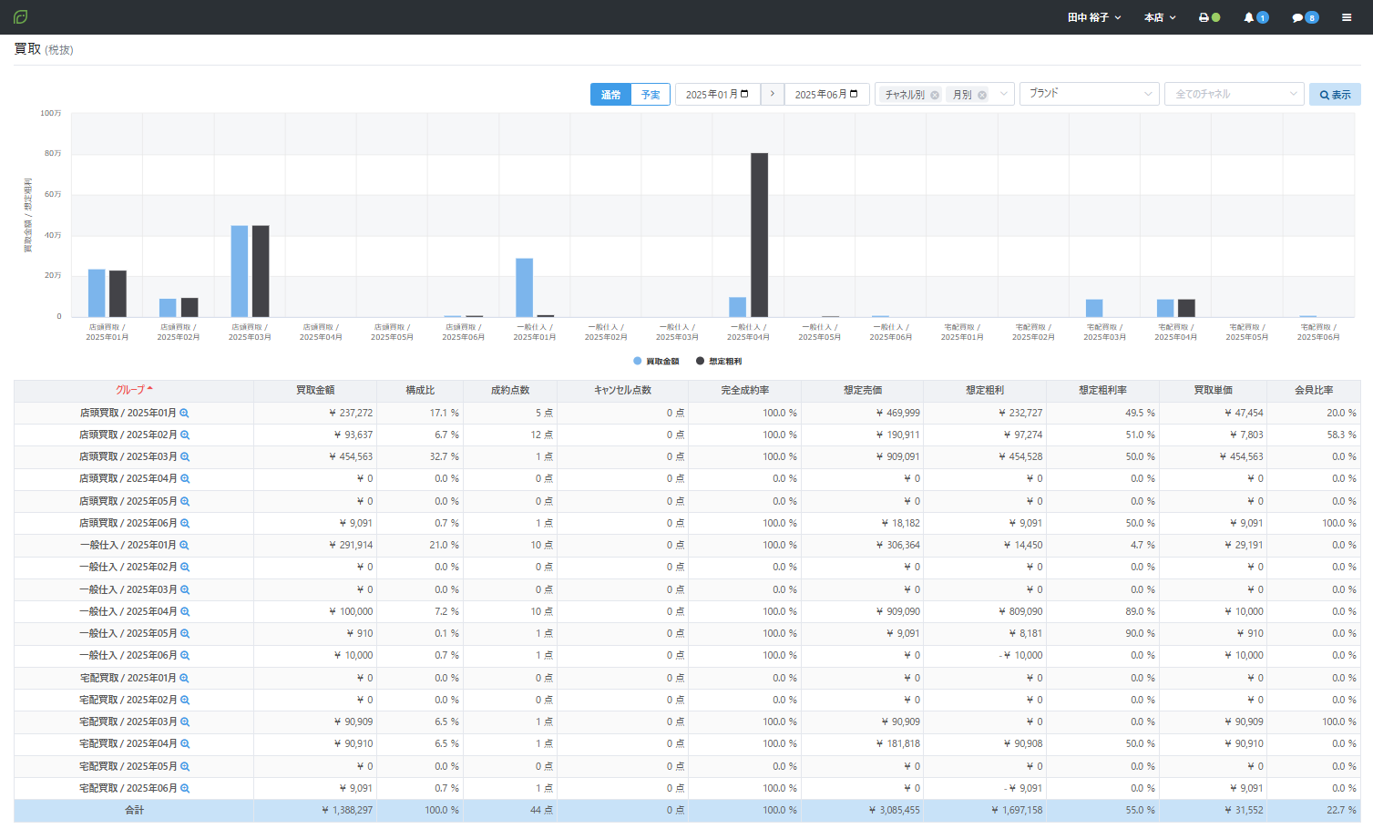 各買取・販売のメニューより売買された結果を元に、今後の目標達成に向け現在の組織のパフォーマンスの動向を把握することが可能です。
