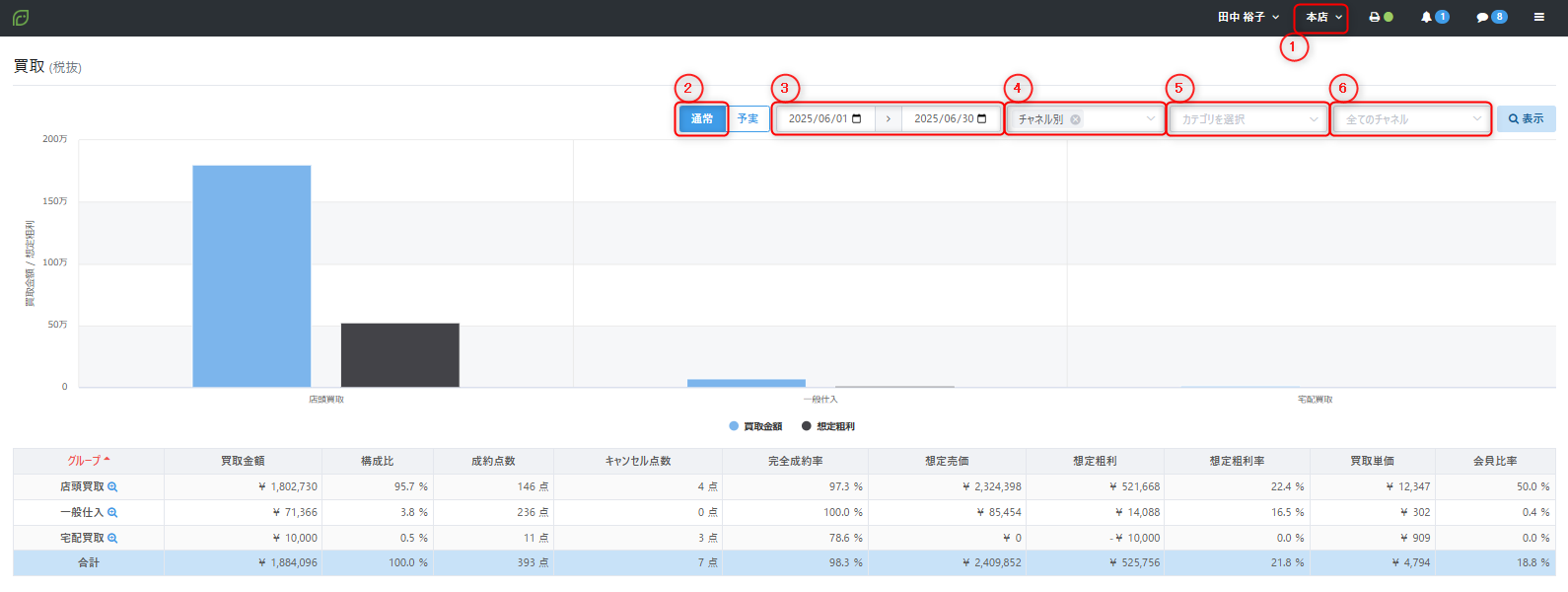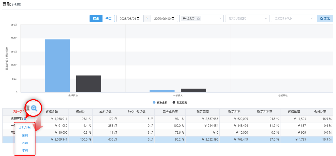 4 | 集計グループ (任意) | 以下より確認したい集計単位を選択(複数指定可) チャネル別:買取メニュー毎 カテゴリ別:買取商品のカテゴリ毎 店舗別:各店舗毎 日別:買取日毎 月別:買取日の月毎 年別:買取日の年毎 |