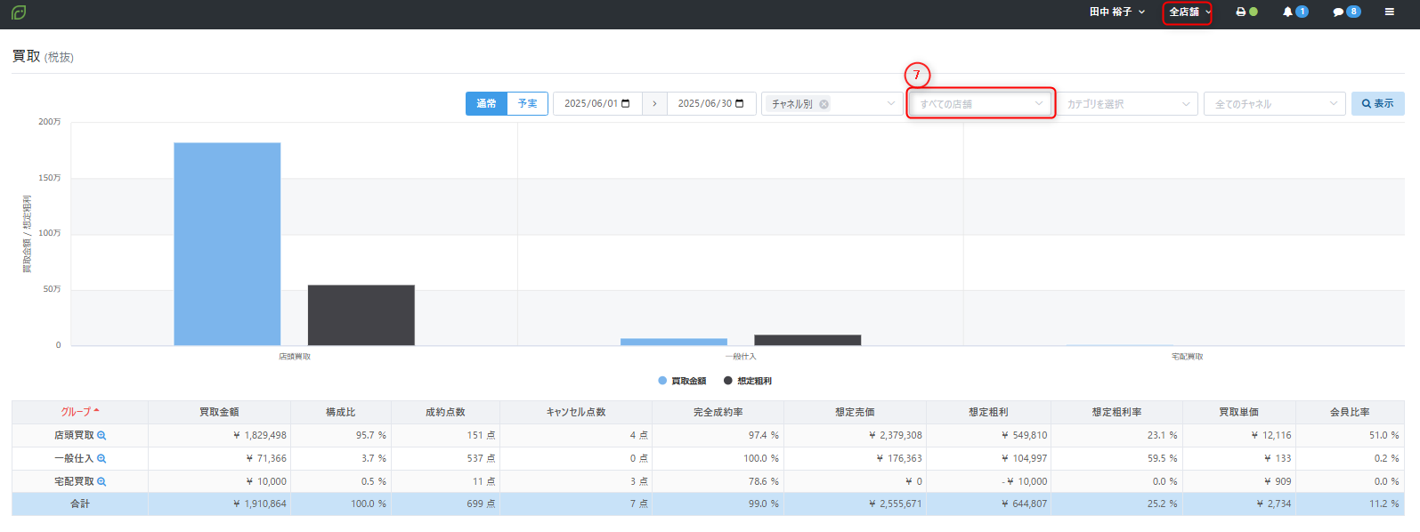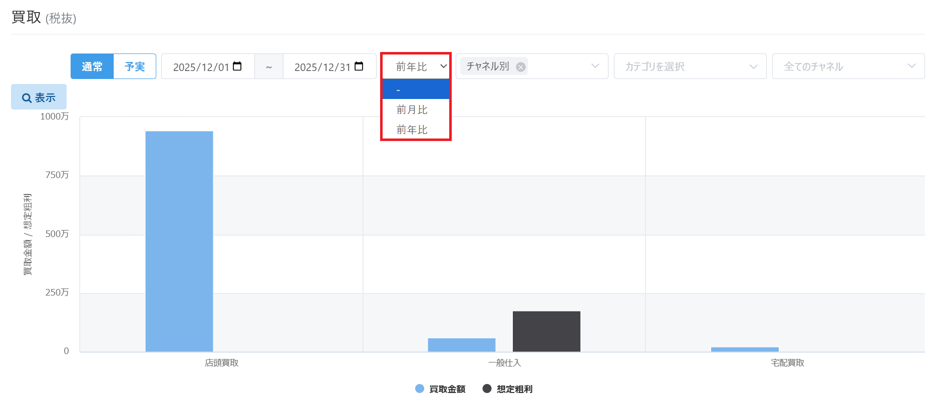 6 | チャネル (任意) | 指定なし:すべての買取メニュー対象 特定のカテゴリ指定:確認したいメニューを選択(複数指定可) |