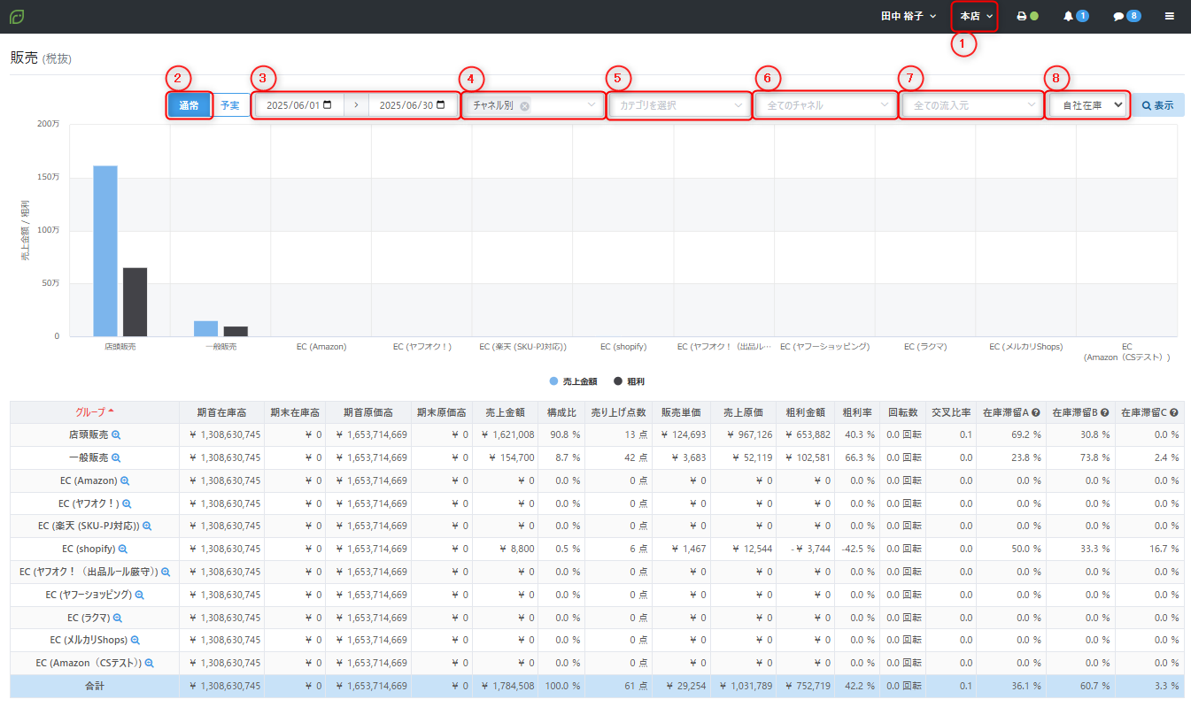 1 | 店舗 (必須) | 確認したい店舗名を1つ選択 全店舗:全店舗の合計・特定店舗の集計対象も可 各店舗名:指定された店舗のみ集計対象 |