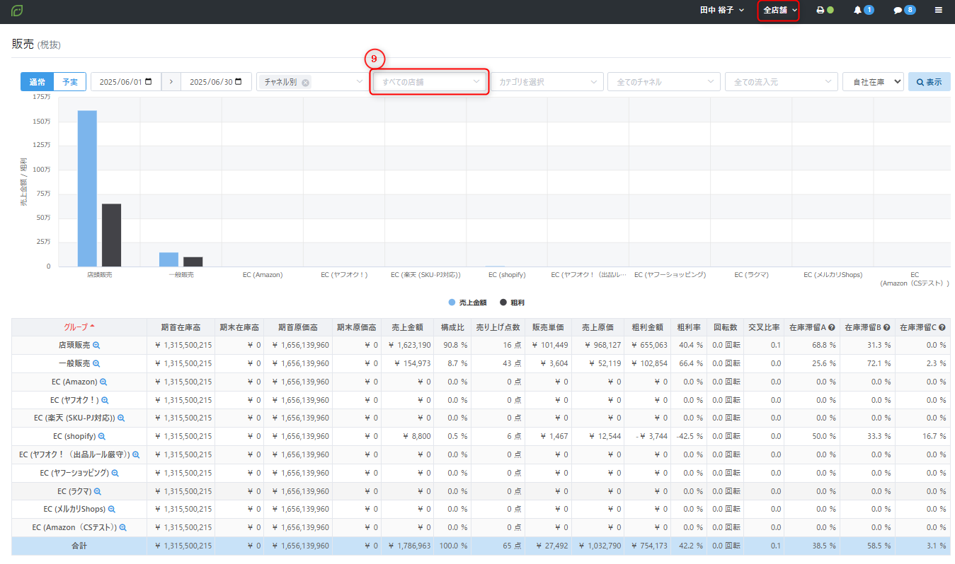 9 | 店舗(任意) ※画面右上①『全店舗』の場合のみ指定可 | 確認したい状況に合わせて指定指定なし:全店舗の集計 各店舗名:指定された店舗のみ集計対象(複数指定可) |