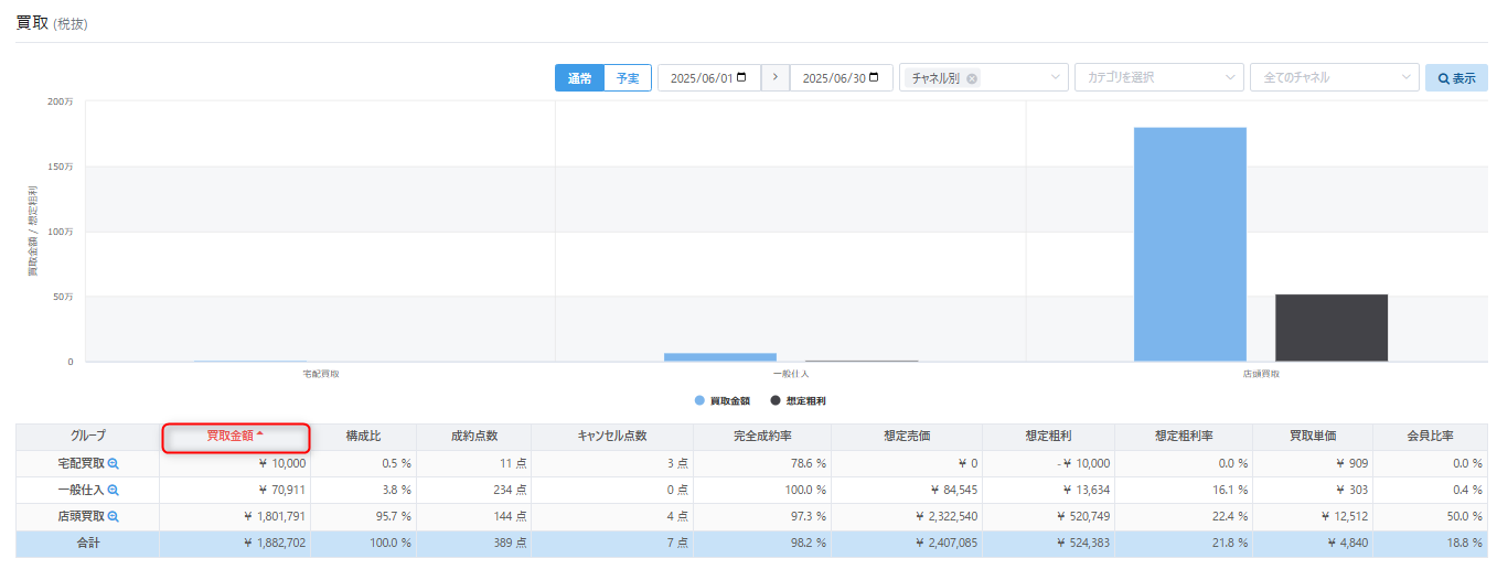 「買取・販売分析」の分析結果は、各項目名をクリックすることで、昇順/降順の並び替えが可能です。(※1項目のみ指定可)