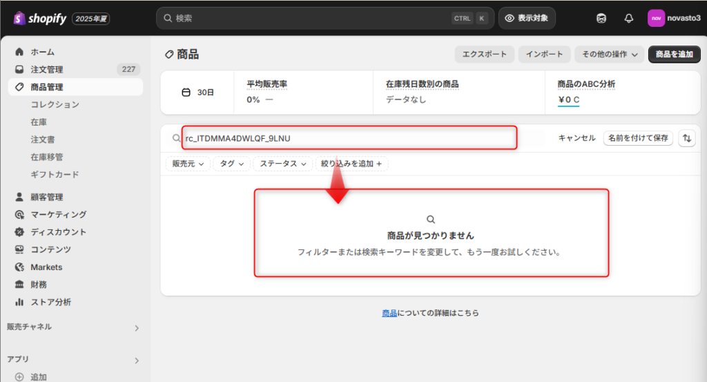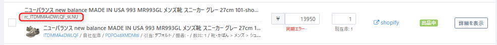 Shopify管理画面の【商品管理】より該当出品の【SKU】を検索