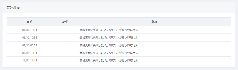 【出品リスト】画面の【価格】に『同期エラー』と表示され、出品の詳細画面の「エラー履歴」に以下のエラーが表示された場合の原因と対応方法を解説します。