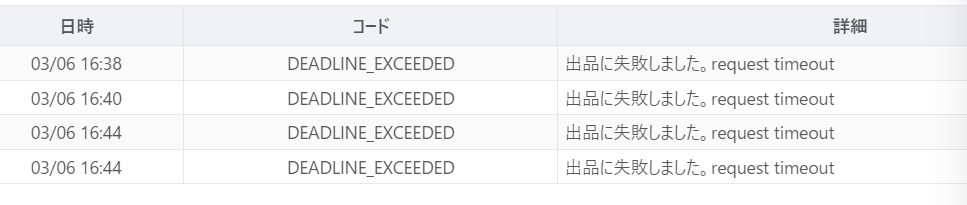 エラー『DEADLINE_EXCEEDED 出品に失敗しました。request timeout』