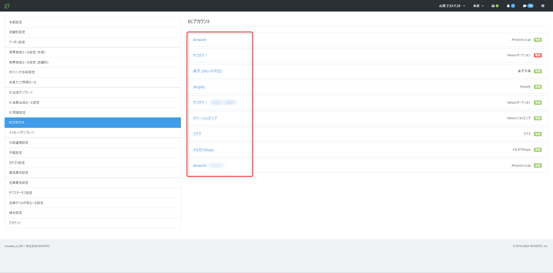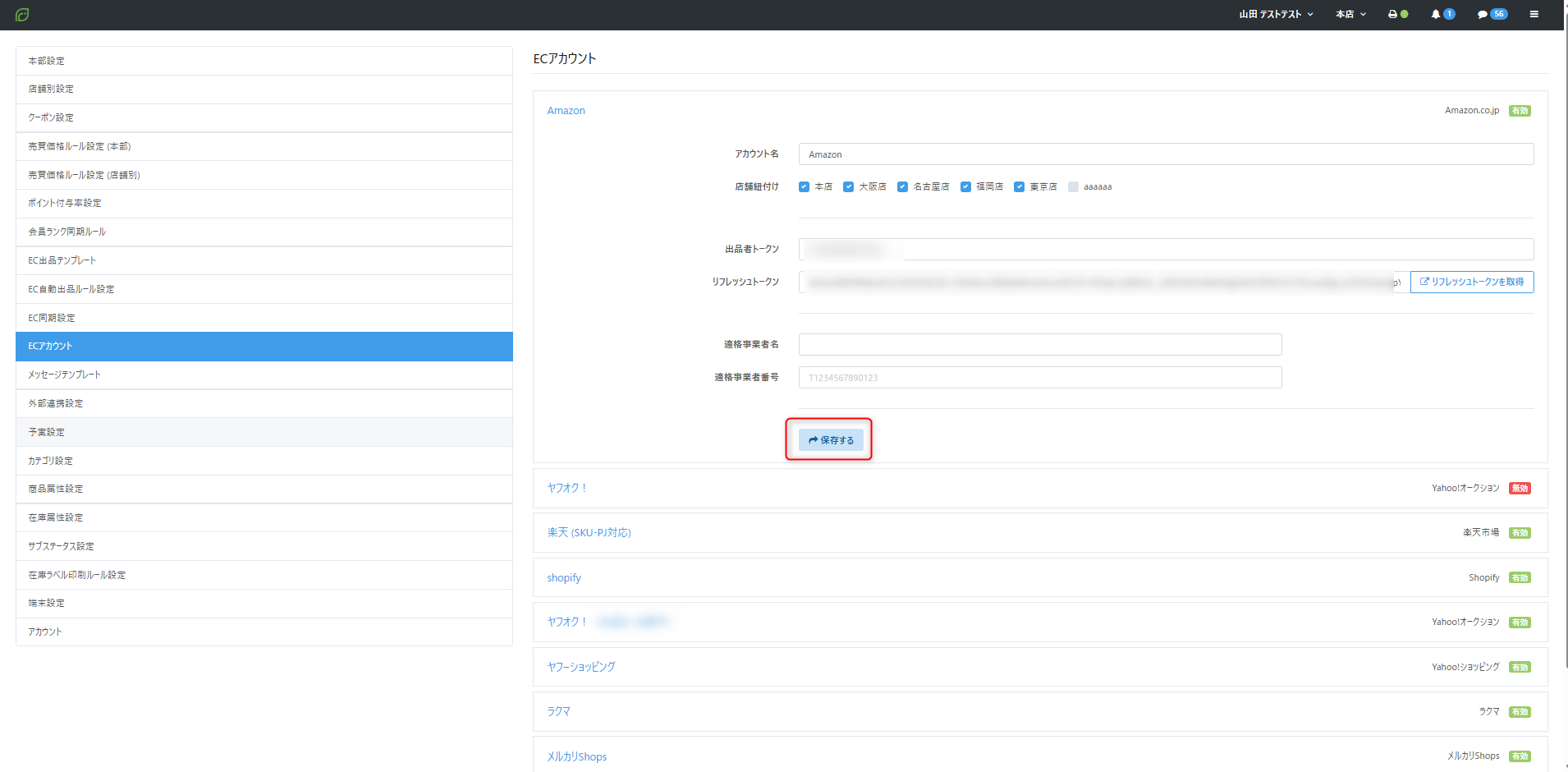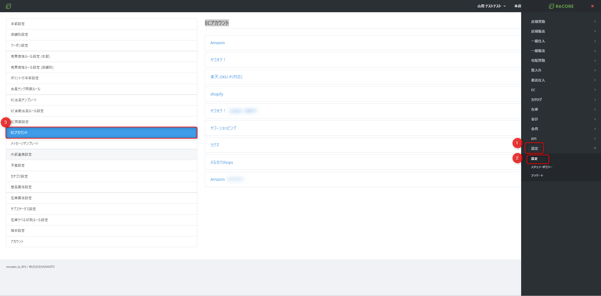ReCOREにおいて、【設定】>【設定】>【ECアカウント】をクリックする