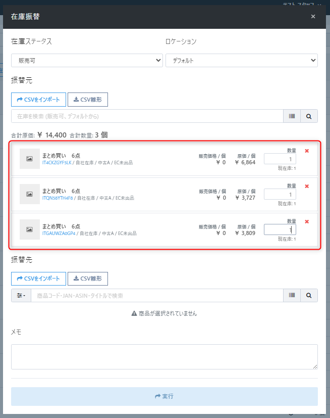 振替元に「まとめ買い商品」の在庫コード(複数のITコード指定可)を指定のうえ、振替先に各カタログコード(PDコード)を指定のうえ、以下のように必要事項を入力のうえ【実行】します。