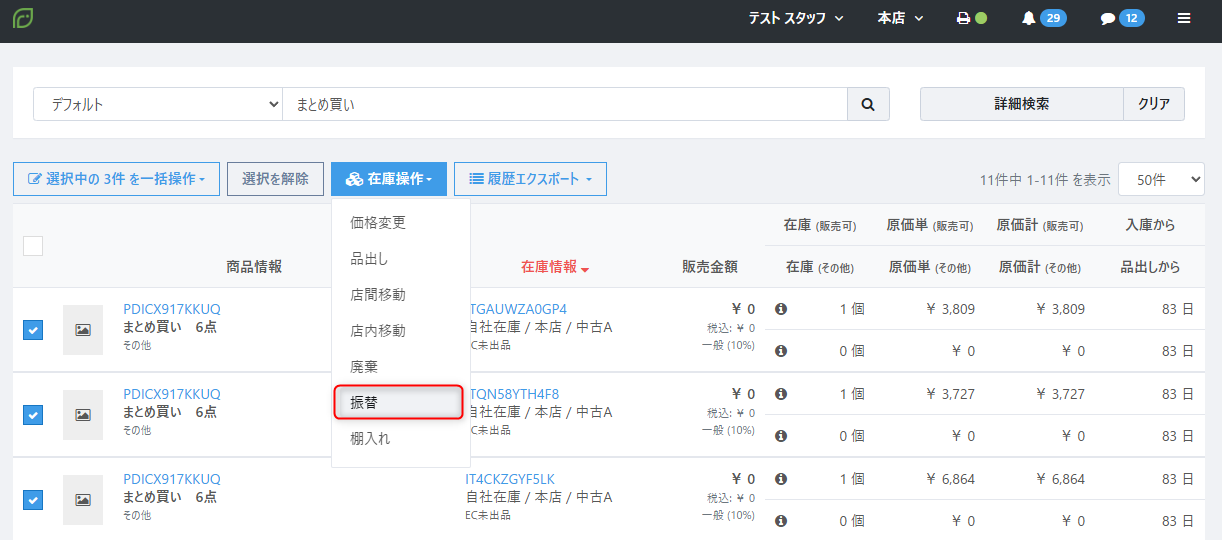 また、以下のような操作も、1回の振替操作で複数在庫に対してまとめて対応できるようになります。