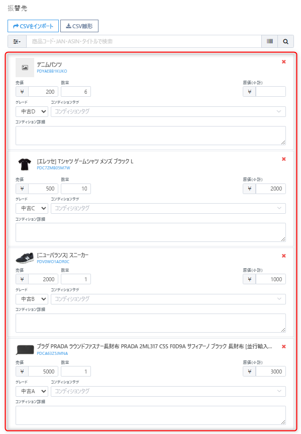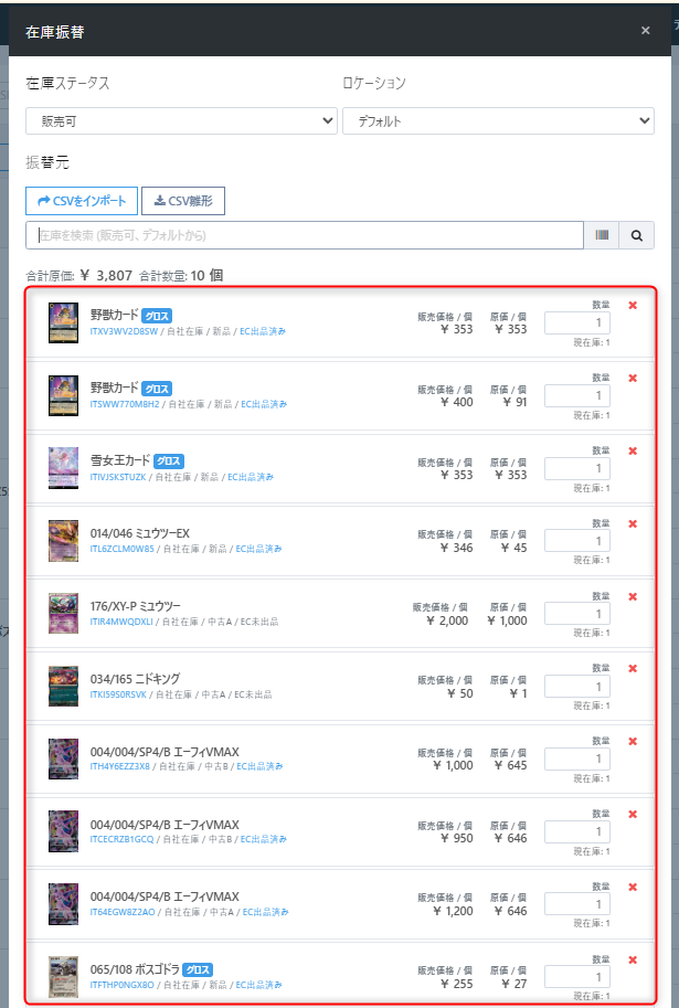 複数の在庫をそれぞれ別の商品(カタログ)に変更