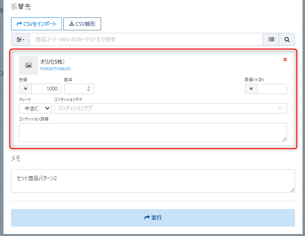 振替元に「セットにしたい商品」の在庫コード(複数のITコード指定可)を指定のうえ、振替先に各カタログコード(PDコード)を指定のうえ、以下のように必要事項を入力のうえ【実行】します。