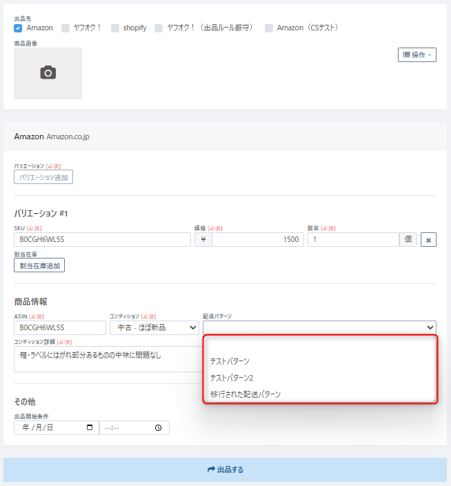 ② テンプレート・出品待ち画面での配送パターン設定【EC出品テンプレート】または【出品待ち】画面にて、【配送パターン】項に表示されるリストから、Amazon側で設定された配送グループを選択し、【保存する】をクリックしてください。