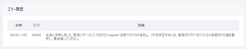 「出品に失敗しました。配送パターンに入力された“〇〇”は受付られません。これを修正するには、商品カテゴリーのリストから承認された値を選択し、再送信してください。」