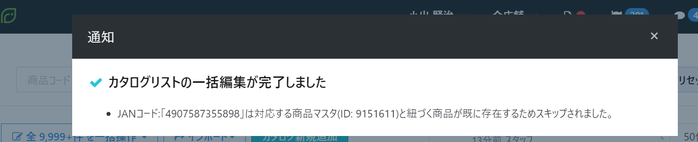 エラー『JANコード:『…』は対応する商品マスタ(ID:〇〇)と紐づく商品が既に存在するためスキップされました』