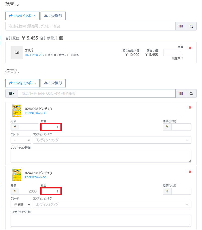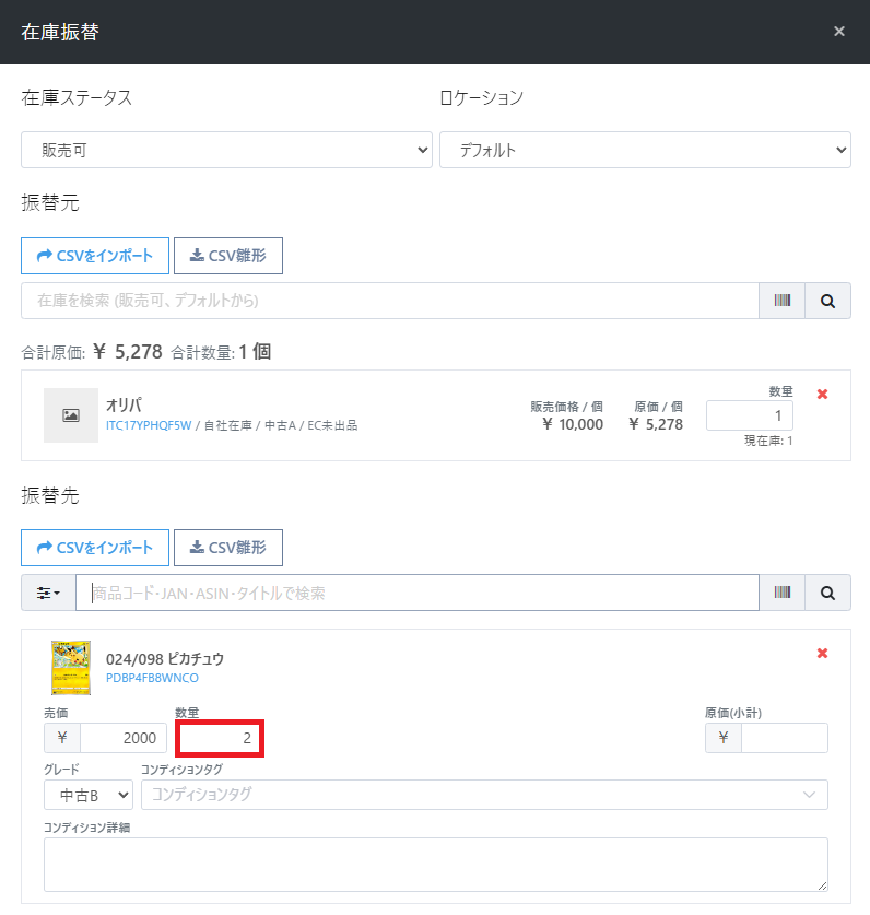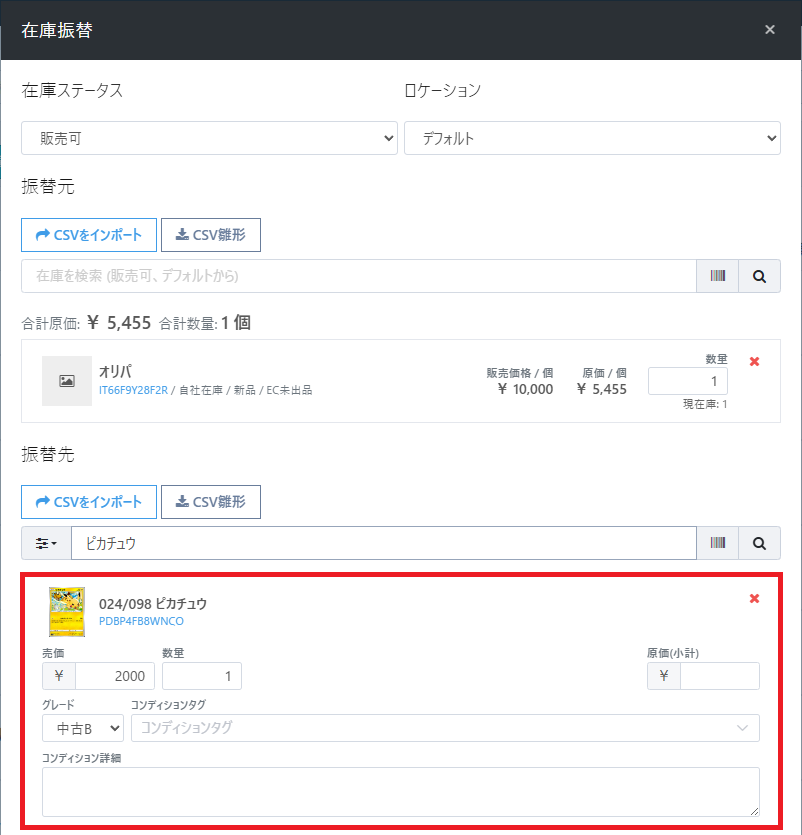 ①同一商品カタログに対して複数の在庫に振替できる機能の追加