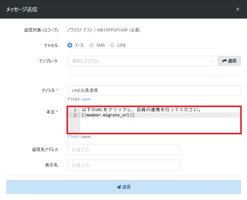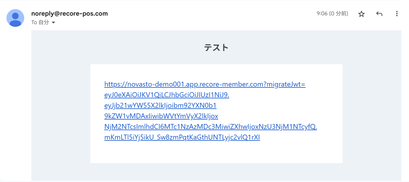 ➌設定完了後、RECOREから会員に対して{{member.migrate_url}}をメールもしくはSMSで送信を行います。