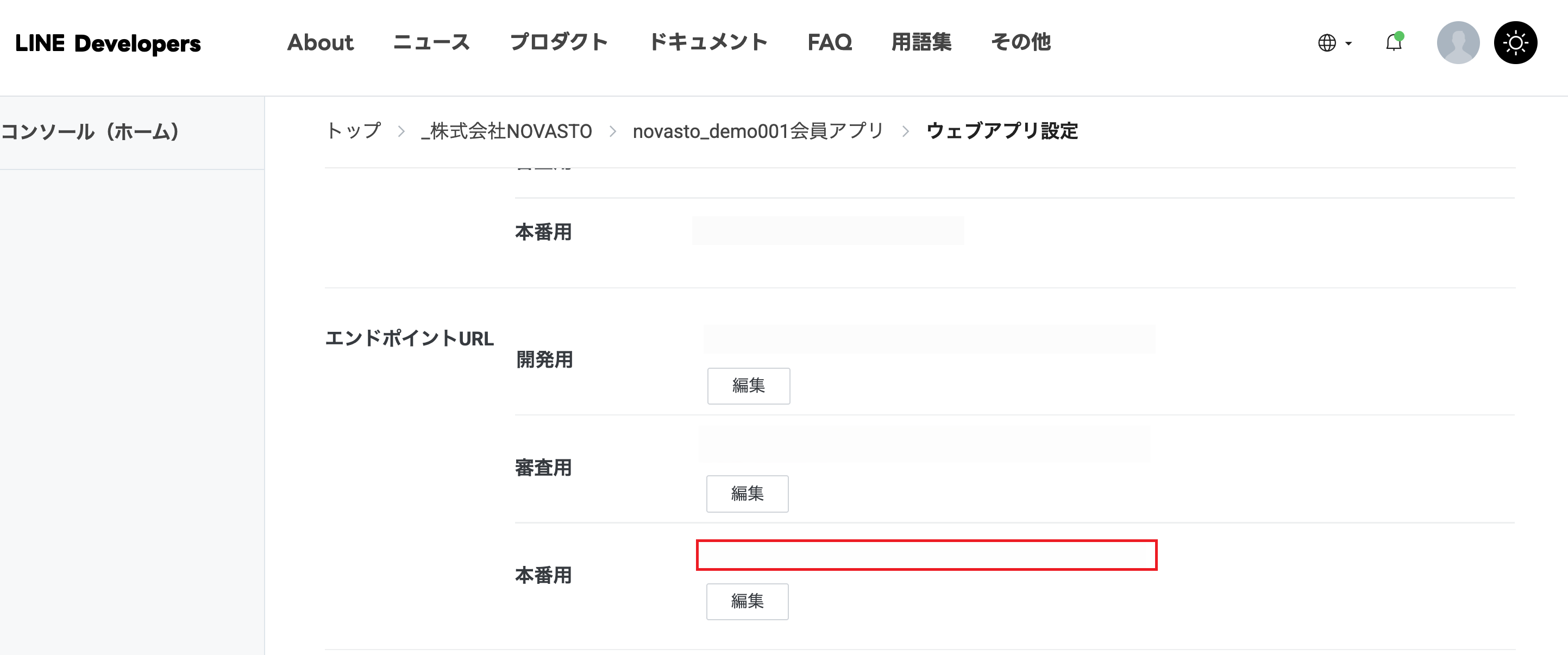 ➊貴社のLINE管理画面の「ウェブアプリ設定」を開き、画面内の「エンドポイントURL」に表示されている「本番用」URLをコピーします。
