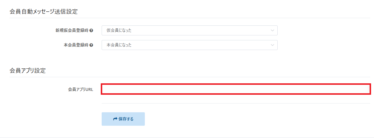 ❷RECOREの【本部設定】の「会員アプリ設定」の「会員アプリURL」に対して、①でコピーした、URLを張り付け、忘れず「保存する」をクリックし設定は完了です。