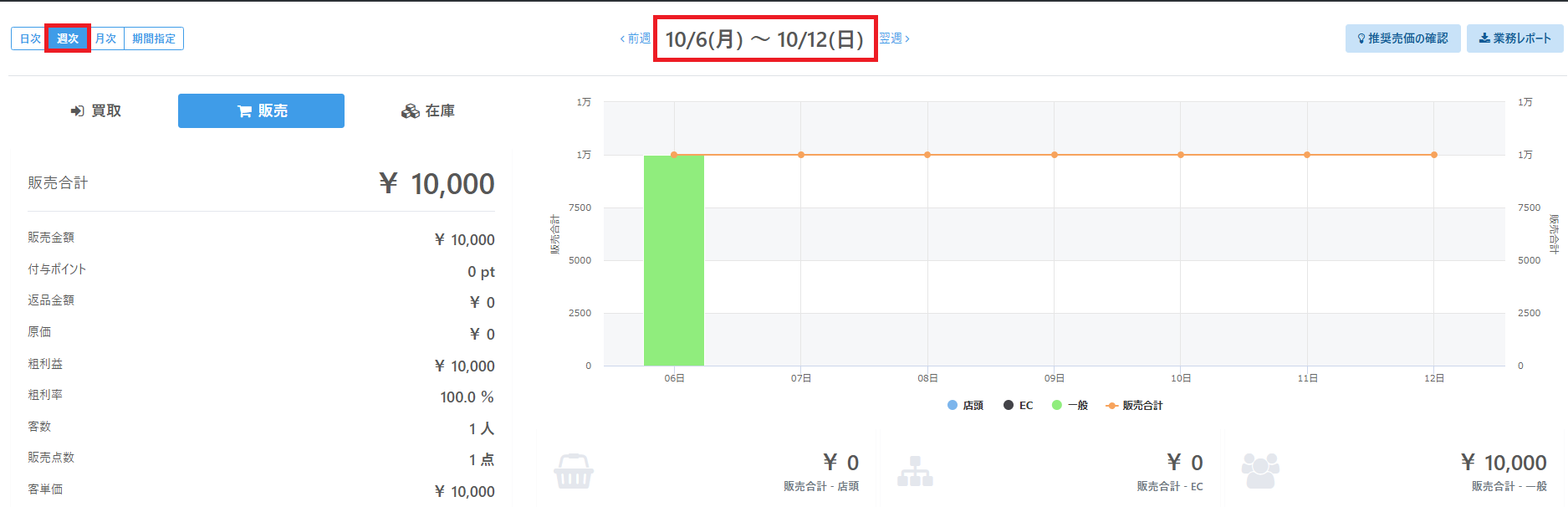 例えば、集計週の切替開始曜日を「月曜日」で指定し、経理レポートで「週次」を指定した場合、日付には「月曜日」~「日曜日」までの期間で集計されます。